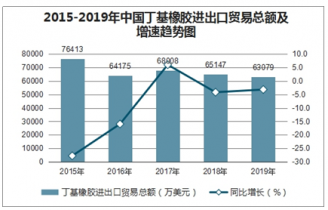2015-2019年中國(guó)丁基橡膠進(jìn)出口貿(mào)易總額及增速趨勢(shì)圖