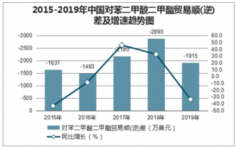 2015-2019年中國對苯二甲酸二甲酯貿易順(逆)差及增速趨勢圖