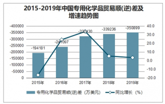 2015-2019年中國專用化學(xué)品貿(mào)易順(逆)差及增速趨勢圖