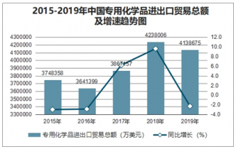 2015-2019年中國專用化學(xué)品進出口貿(mào)易總額及增速趨勢圖