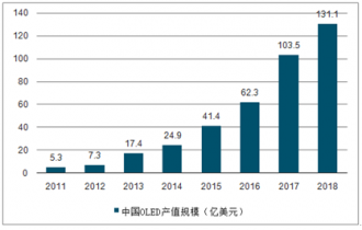 在中國市場方面,隨著OLED布局、技術進步的不斷提升下,我國OLED產業(yè)規(guī)模高速增長。2011年以來中國OLED產值規(guī)模持續(xù)穩(wěn)定增長,從5.3億美元增長至2018年的131.1億美元,七年間增長了近百億美元。