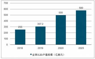 截止至2018年全球OLED產值規(guī)模達到了255億美元。預測2019年全球OLED產值規(guī)模將突破300億元,達到了307.2億美元。預測在2020年全球OLED產值規(guī)模將達500億美元左右。并預測在2025年全球OLED產值規(guī)模將增長至一個頂峰,達到580億美元。