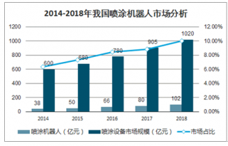 噴涂機器人的使用年限一般在10年以上,相比于噴涂設備3到5年的使用年限,噴涂機器人無疑具有明顯的優勢,隨著智能制造的發展,在傳統噴涂設備更新之際將成為噴涂機器人替代的契機。噴涂機器人行業正快速發展,噴涂機器人設備在噴涂設備市場占比逐年攀升,由2014年的6.33%增至2018年的10%。