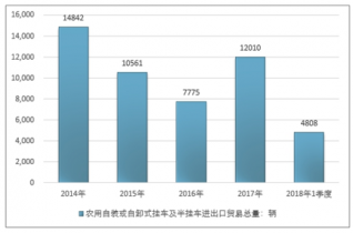 2016年我國農(nóng)用自裝或自卸式掛車及半掛車進出口貿(mào)易總量7775輛 ,2017年進出口貿(mào)易總量12010輛 ;2019年1季度進出口貿(mào)易總量4808輛 。