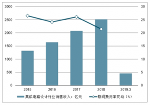 2015-2019.3中國集成電路設(shè)計(jì)行業(yè)銷售收入及增長走勢
