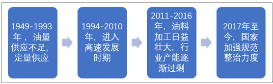 中國食用油行業起步較晚,新中國成立至今,中國食用油行業經歷了定量供應階段、快速發展階段、產能過剩與去產能階段、健康消費與重新整頓階段。