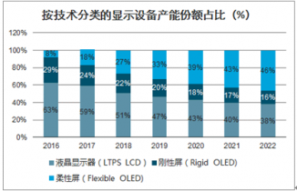 按技術(shù)分類的顯示設(shè)備產(chǎn)能份額占比(%)