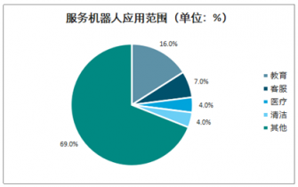 服務(wù)機(jī)器人是龐大機(jī)器人家族中的一個(gè)年輕成員,到目前為止尚沒(méi)有一個(gè)嚴(yán)格的定義。根據(jù)其用途不同,可以劃分為保潔機(jī)器人、教育機(jī)器人、醫(yī)療機(jī)器人、家用機(jī)器人、服務(wù)型機(jī)器人及娛樂(lè)機(jī)器人,應(yīng)用范圍非常廣泛。目前,教育機(jī)器人市場(chǎng)份額約為16%,客服機(jī)器人份額約7%,醫(yī)療、清潔用服務(wù)機(jī)器人占比均在4%左右。