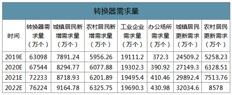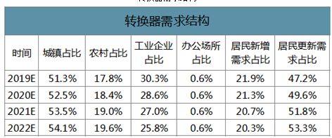 我國轉換器需求以居民生活需求為主,其中城鎮居民需求占比約為54%,農村居民需求占比17%至20%,主要原因一方面為城鎮化率持續提升;另一方面城鎮居民家用電器、電子設備等保有量高于農村。從新增與更新需求角度來看,更新需求大于新增需求,預計至2022年居民更新需求與新增需求分別占比53%和20%。