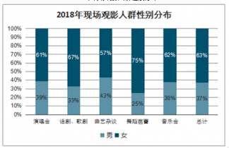 2018年現(xiàn)場(chǎng)觀看演出觀眾中,超過50%為90后,約20%為95后。年輕觀眾最喜歡觀看演唱會(huì),其次為話劇、歌劇,40周歲以上人群傾向于觀看舞蹈類演出。同時(shí),2018年女性觀眾比例由2017年的61%提高到63%,男性觀眾最喜歡觀看曲藝類演出,話劇、歌劇最受女性觀眾青睞。