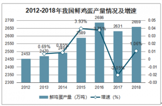 雞蛋是一種肉類替代品,富含蛋白質、維生素以及氨基酸,在生活中充當了不可缺的角色。我國是世界第.一雞蛋生產大國,2012年我國雞蛋產量為2453萬噸,到2016年達到最高產量,為2686萬噸,然后到2018年下降至2659萬噸。