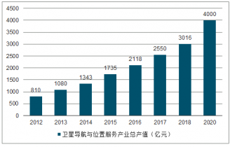 2012年我國衛星導航與位置服務產業總產值已達810億元,并呈現逐年高速增長態勢。2014年我國衛星導航與位置服務產業總產值突破千億元,截止至2017年我國衛星導航與位置服務產業保持高速發展,總體產值達到2550億元,較2016年增長20.4%。進入2018年我國衛星導航與位置服務產業總體產超3000億元,達到了3016億元,比2017年的2550億元增長近20%。并預測在2020年我國衛星導航與位置服務產業總產值將達到4000億元左右。
