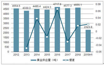 2012-2019年上半年全球黃金供應(yīng)量統(tǒng)計(jì)及增速