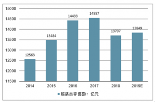 2017年服裝類零售總額達14557億元,相比2012年的9778億元增加了4779億元。2018年服裝類零售總額13707億元,預計2019年年服裝類零售總額達到13849億元。