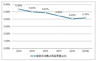 2014-2019年中國服裝類消費占商品零售占比趨勢及預測