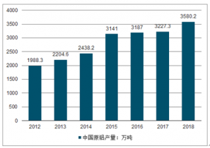 2016年我國原鋁產(chǎn)量為3187萬噸,產(chǎn)量較上年同期增長1.46%。2017年我國原鋁產(chǎn)量為3227.3萬噸,產(chǎn)量較上年同期增長1.26%。2018年我國國內(nèi)原鋁產(chǎn)量為3580.2萬噸