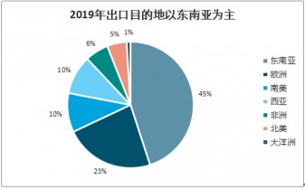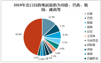 2019年出口目的地居前的為印度、巴西、韓國、越南等