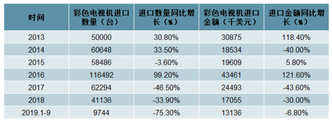 2013-2019年9月中國彩色電視機進口數(shù)量及進口金額統(tǒng)計表
