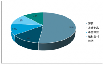 聚乙烯可用擠出、注射、模塑、吹塑和熔紡等方法成型,廣泛應(yīng)用于工業(yè)、農(nóng)業(yè)、包裝及日常工業(yè)中,薄膜(52%)是其最大的用戶,另外,注塑制品(13%)、中空容器(12%)、管材型材(11%)等都占有較大的比例。
