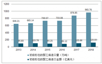 2013-2018年中國(guó)初級(jí)形態(tài)的聚乙烯進(jìn)口量及進(jìn)口金額統(tǒng)計(jì)