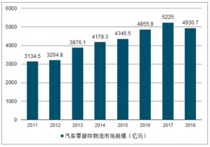 2011-2018年我國(guó)汽車零部件物流市場(chǎng)規(guī)模走勢(shì)
