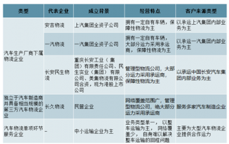 汽車零部件物流行業市場化程度較高,不存在準入制度,進入和退出沒有行政性障礙。按目前我國汽車零部件物流行業的競爭特點,目前行業中主要有三種類型的參與競爭者:第.一類是由國內大型汽車制造企業控股或參股的企業;第二類是獨立于汽車制造商并具備相當規模的第三方汽車零部件物流企業;第三類是其他眾多中小型運輸企業。下表簡單概括了這三類企業中的代表以及各自經營特點。
