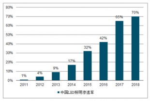 照明技術革命推動 LED 普及。 通用照明市場可以分為 LED 通用照明和傳統照明,全球照明行業經歷 19 世紀末白熾燈、 上世紀初節能熒光燈、 80 年代節能燈再到目前的 LED 照明四個階段,LED 照明憑借著能效比更高、壽命更長、 更節能環保等諸多優勢正實現對傳統照明產品的替代,各國政府相繼出臺禁用白熾燈的政策,我國于 2016 年 10 月 1 日起,禁止進口和銷售 15 瓦及以上普通照明白熾燈。 隨著技術進步、 LED 芯片價格下跌使得綜合成本降低,LED 照明的滲透率迅速提升,不論是 Digitimes 還是麥肯錫的報告全球 LED 通用照明的滲透率在 2010 年后提升速度明顯加快,未來滲透率還有提升空間。