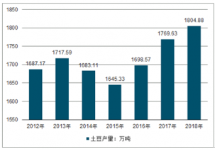 近年來,我國土豆產量不斷增長,2012年國內土豆產量約1687.17萬噸,到2018年國內土豆產量約1804.88萬噸。