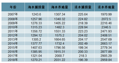 水產(chǎn)品分為養(yǎng)殖和捕撈兩大類。1985年我國開放了水產(chǎn)品市場,水產(chǎn)養(yǎng)殖行業(yè)逐漸起步;從1988年開始,我國人工養(yǎng)殖產(chǎn)量首次超過天然捕撈,這是中國漁業(yè)實行產(chǎn)業(yè)結(jié)構(gòu)調(diào)整實現(xiàn)養(yǎng)殖產(chǎn)量超過天然捕撈產(chǎn)量的歷史性大轉(zhuǎn)變。2018年我國水產(chǎn)品產(chǎn)量為6457.66萬噸,其中海水產(chǎn)品產(chǎn)量為3301.43萬噸,淡水產(chǎn)品產(chǎn)量為3156.23萬噸。