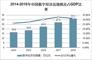 2014-2018年中國數字經濟總規模及占GDP比重