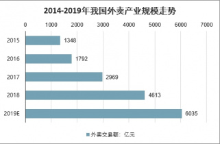 2019年前三季度,我國外賣產業交易額分別為1200億元、1430億元、1790億元,第三季度環比增長25.2%。外賣訂單量也持續上漲,外賣市場仍有巨大的增長潛力。2019年前三季度中國外賣行業交易額為4420億元,接近2018年全年外賣行業交易額4613億元。預計2019年全年中國外賣行業交易額將達到6035億元,相比2018年增長30.8%,繼續保持快速增長態勢。