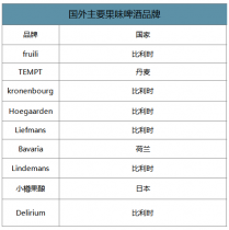 2019年國外果味啤酒前九品牌分別為:芙力(fruili)、誘惑(TEMPT)、克倫堡凱旋1664(kronenbourg)、福佳(Hoegaarden)、樂蔓啤酒(Liefmans)、寶華利(Bavaria)、林德曼(Lindemans)、小樽果釀、粉象(Delirium)。