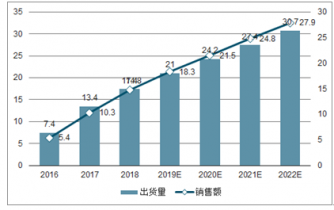 2017年全球無線耳機(jī)出貨量近1.34億副,較2016年上升約80%,其對應(yīng)銷售金額由2016 年的54億美元提升至2017年的103億美元。預(yù)計到2022年,全球無線耳機(jī)出貨量和銷售額將分別達(dá)3.07億副和279億美元,較2017年相比年化增長率近20%左右,市場規(guī)模增速較快。