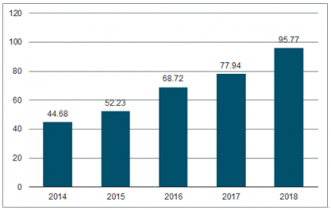 我國質譜儀進口金額整體呈現逐年增加的趨勢,自2014年的44.68億元增加至2018年的96.77億元,年均復合增長率達21.00%。