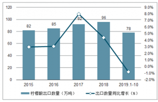 2015-2019年1-10月中國檸檬酸出口數(shù)量及增速趨勢(shì)圖