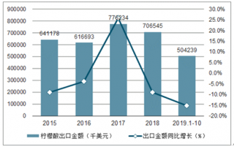 2015-2019年1-10月中國檸檬酸出口金額及增速趨勢(shì)圖