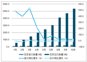 2019年1-10月花茶進(jìn)口數(shù)量為286.6噸,同比增長21.0%;出口數(shù)量為5354.2噸,同比下降3.4%。2019年1-10月花茶進(jìn)口金額為289.8萬美元,同比下降7.8%;出口金額為5114.4萬美元,同比下降3.4%。