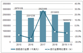 2019年1-10月中國廢鋁進口數量為130萬噸,同比增長1.4%;2019年1-10月中國廢鋁進口金額為1806672千美元,同比下降13.6%。