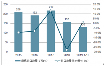 2015-2019年1-10月中國廢鋁進口數量及增速趨勢圖