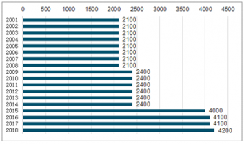 2001-2018年中國(guó)螢石資源儲(chǔ)量情況