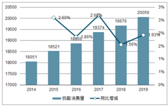 圖表:2015-2019年美國(guó)奶酪消費(fèi)量及增長(zhǎng)率走勢(shì)(單位:萬(wàn)噸,%)