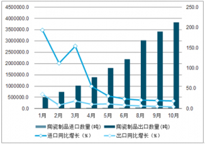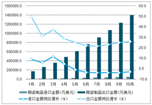 2019年1-10月陶瓷制品進口數量為64182.7噸,同比增長19.0%;出口數量為3827037.8噸,同比增長4.7%。2019年1-10月陶瓷制品進口金額為51443.6萬美元,同比下降2.9%;出口金額為1396369萬美元,同比增長25.9%。