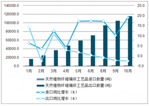 2019年1-10月中國天然植物纖維編織工藝品累計進出口數量及增速趨勢圖