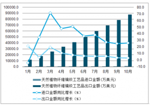 2019年1-10月中國天然植物纖維編織工藝品累計進出口金額及增速趨勢圖