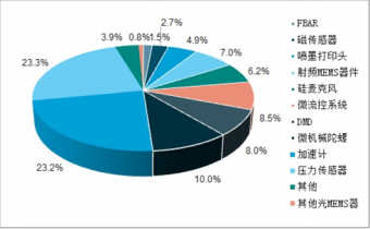 從中國產(chǎn)品結(jié)構(gòu)來看,份額最大的是壓力傳感器,市場占比達(dá)到23.3%,汽車工業(yè)、生物醫(yī)學(xué)、工業(yè)控制、航空航天等多領(lǐng)域應(yīng)用廣泛;其次是加速度傳感器占比23.2%,在消費(fèi)電子和汽車中的廣泛應(yīng)用也保持著穩(wěn)步增長;MEMS陀螺儀發(fā)展較快在航空、航天、航海、汽車、生物醫(yī)學(xué)和環(huán)境監(jiān)控等領(lǐng)域得到了應(yīng)用,占比達(dá)到10%。