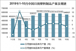 2019年10月中國日用塑料制品產(chǎn)量為548937噸,同比下降2.2 %;2019年1-10月中國日用塑料制品產(chǎn)量為5354414噸,同比下降1.7%。
