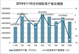 2019年10月中國輕革產(chǎn)量為43362408平方米,同比下降12.5%;2019年1-10月中國輕革產(chǎn)量為466866902平方米,同比增長0.3%。