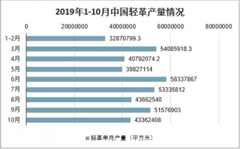 2019年10月中國輕革產(chǎn)量為43362408平方米,同比下降12.5%;2019年1-10月中國輕革產(chǎn)量為466866902平方米,同比增長0.3%。