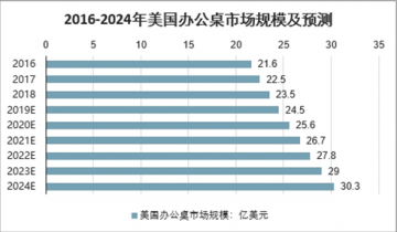 2016年美國辦公桌的規模約為21.6億美元,預計2017-2024年CAGR達4.3%,至2024年有望達到30.3億美元。