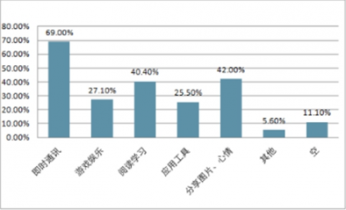 在社交軟件最常使用功能分布中,即時通訊(占69%)、分享圖片、心情(42%)占據前兩位,這也是社交軟件的最基礎和最主要的功能。閱讀學習(占40.4%)、游戲娛樂(占27.1%)、應用工具(占25.5%)則體現了社交軟件功能的多樣化,閱讀學習排名較高的情況與調查中高收入人群占比高以及文化教育成為增加支出的首選的群體畫像有較大聯系